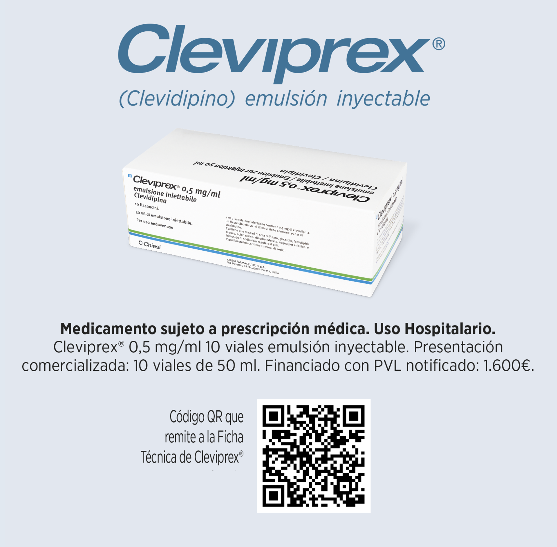 1. Keating GM. Clevidipine: a review of its use for managing blood pressure in perioperative and intensive care settings. Drugs. 2014 Oct;74(16):1947-1960. doi: 10.1007/s40265-014-0313-6. 2. Cleviprex 0,5 mg/ml emulsión inyectable. Ficha técnica. CIMA. Agencia Española de Medicamentos y productos sanitarios. Fecha de acceso:Abril 2025. Disponible en: https://cima.aemps.es/cima/dochtml/ft/76595/FT_76595.html. 3. Levy JH, Mancao MY, Gitter R, Kereiakes DJ, Grigore AM, AronsonS, Newman MF. Clevidipine effectively and rapidly controls blood pressure preoperatively in cardiac surgery patients: the results of the randomized, placebo-controlled efficacystudy of clevidipine assessing its preoperative antihypertensive effect in cardiac surgery-1. Anesth Analg. 2007;105(4):918-25. 4. Singla N, Warltier DC, Gandhi SD, Lumb PD,Sladen RN, Aronson S, Newman MF, Corwin HL; ESCAPE-2 Study Group. Treatment of acute postoperative hypertension in cardiac surgery patients: an efficacy study ofclevidipine assessing its postoperative antihypertensive effect in cardiac surgery-2 (ESCAPE-2), a randomized, double-blind, placebo-controlled trial. Anesth Analg. 2008Jul;107(1):59-67. 5. Bergese SD, Puente EG. Clevidipine butyrate: a promising new drug for the management of acute hypertension. Expert Opin Pharmacother. 2010;11(2):281-95.doi: 10.1517/14656560903499293. 6. Nordlander M, Sjöquist PO, Ericsson H, Rydén L. Pharmacodynamic, pharmacokinetic and clinical effects of clevidipine, an ultrashort-actingcalcium antagonist for rapid blood pressure control. Cardiovasc Drug Rev. 2004 Fall;22(3):227-50. 7. Ericsson H, Bredberg U, Eriksson U, Jolin-Mellgård A, Nordlander M, RegårdhCG. Pharmacokinetics and arteriovenous differences in clevidipine concentration following a short- and a long-term intravenous infusion in healthy volunteers. Anesthesiology.2000; 92(4):993-1001. 8. Aronson S et al. The ECLIPSE Trials: Comparative Studies of Clevidipine to Nitroglycerin, Sodium Nitroprusside, and Nicardipine for Acute HypertensionTreatment in Cardiac Surgery Patients. Anesth Analg 2008;107:1110-21. 9. Mohhseni S et al. Perioperative Hypertension Etiologies in Patients Undergoing Noncardiac Surgeryin University Health Network Hospitals–Canada from 2015–2020. Integrated Blood Pressure Control 2022:15, 23-32. 10. Whelton PK et al. 2017 ACC/AHA/AAPA/ABC/ACPM/AGS/APhA/ASH/ASPC/NMA/PCNA Guideline for the Prevention, Detection, Evaluation, and Management of High Blood Pressure in Adults. Hypertension. 2017; 00:e000-e000.11. Varon and Marik, Vascular Health and Risk Management, 2008; 4(3): 615-627. 12. Aronson S et al. Isolated systolic hypertension is associated with adverse outcomes fromcoronary artery bypass grafting surgery. Anesth Analg. 2002;94:1079-1084. 13. Aronson S et al. Does perioperative systolic blood pressure variability predict mortality after cardiacsurgery? An exploratory analysis of the ECLIPSE trials. Anesth Analg 2011 Jul;113(1):19-30. 14. Meng L et al. Blood Pressure Targets in Perioperative Care. Provisional ConsiderationsBased on a Comprehensive Literature Review. Hypertension. 2018;72:806-817. 15. Futier E et al. Effect of Individualized vs. Standard Blood Pressure Management Strategies onPostoperative Organ Dysfunction Among High-Risk Patients Undergoing Major Surgery A Randomized Clinical Trial. JAMA 2017. 16. Balzer F et al. High Post-Operative BloodPressure following Cardiac Surgery Is Associated with Acute Kidney Injury and Death. J Cardiothorac Vasc Anesth. 2016; 30(6):1562-1570. 17. Salmasi V et al. Relationship betweenIntraoperative Hypotension, Defined by Either Reduction from Baseline or Absolute Thresholds, and Acute Kidney and Myocardial Injury after Noncardiac Surgery. A RetrospectiveCohort Analysis. Anesthesiology 2017; 126:47-65. 18. Meng L et al. Perioperative goal-directed haemodynamic therapy based on flow parameters: a concept in evolution. British Journalof Anaesthesia 2016; 117 (S3): iii3–iii17. 19. Salgado DR et al. Control of hypertension in the critically ill: a pathophysiological approach. Annals of Intensive Care 2013; 3:17. 20. Elgadil 5mg/ml solución inyectable y para perfusión. Resumen de las características de producto. Disponible en: [http://www.aemps.es] (acceso: 10/6/2015). 21. Brevibloc 10 mg/mlsolucióninyectable. Resumen de las características de producto. Disponible en: [http://www.aemps.es] (acceso: 10/6/2015). 22. Trandate 5 mg/ml solución inyectable. Resumen de lascaracterísticas de producto. Disponible en: [http://www.aemps.es] (acceso: 10/6/2015). 23. Solinitrina solución inyectable. Resumen de las características de producto. Disponibleen: [http://www.aemps.es] (acceso: 10/6/2015). 24. Nitroprussiat Fides 50 mg polvo y disolvente para solución inyectable. Resumen de las características de producto. Disponibleen: [http://www. aemps.es] (acceso: 10/6/2015). 25. Vasonase 1 mg/ml solución para perfusión. Resumen de las características de producto. Disponible en: [http://www.aemps.es] (acceso: 10/6/2015).15935 – Julio 2025